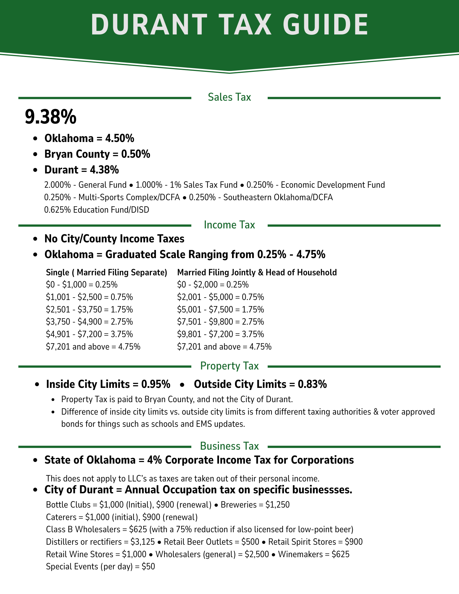 For a quick overview of local taxes, download the Durant Tax Guide here.
