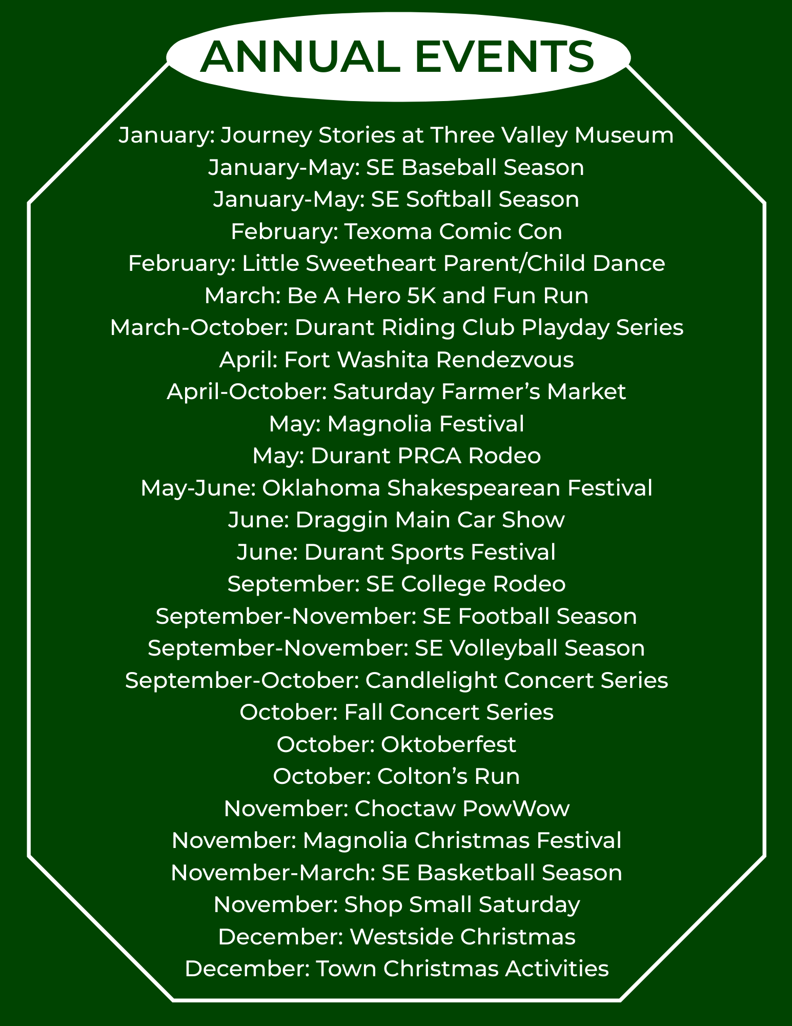 Durant's calendar is filled with events that bring people together. From lively festivals and live music to cherised traditions and seasonal celbrations, each occasion reflects the city's vibrant spirit ans sense of community.